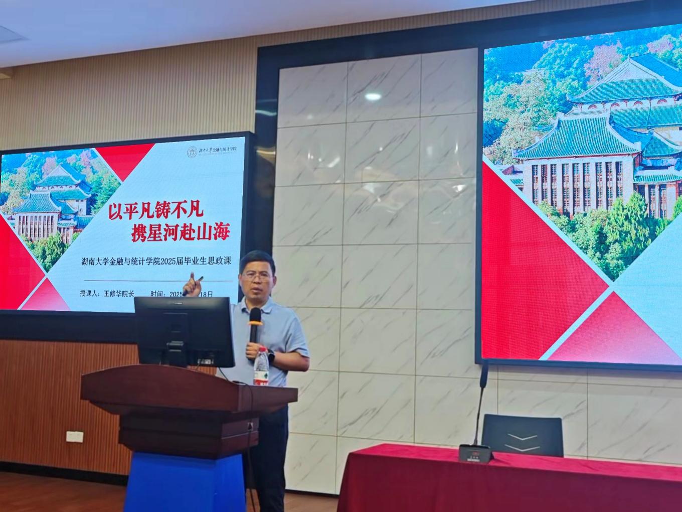 6月18日下午,sunbet集团中国官网入口2025届毕业生思政课在财院校区老食堂二楼报告厅举办。学院院长王修华以《以平凡铸不凡,携星河赴山海》为题为毕业生授课,2025届全体毕业生参加。