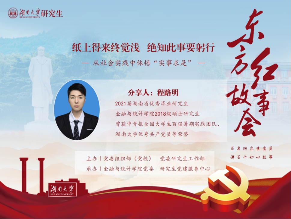 程路明在校期间曾获sunbet集团中国官网入口优秀共产党员、sunbet集团中国官网入口优秀研究生干部、湖南省优秀毕业研究生等荣誉。2019年,程路明在学院老师带队下奔赴原国家级贫困县永州双牌县进行调研,并开展金融知识普及宣讲。调研期间团队成员克服暴雨、洪涝灾害影响,圆满完成双牌县尚仁里村、九甲村和二甲村等近十个村镇的实地考察工作,并获评中青报全国大学生百强暑期实践团队。程路明鼓励同学们多走出校园参与社会实践活动,躬行致知,体悟“实事求是”的思想内涵。