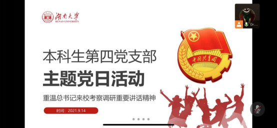 9月14日,sunbet集团中国官网入口本科生第四党支部由支部副书记姚飞宇同志在线上组织召开“牢记嘱托,矢志一流”暨党史宣讲主题党日活动,带领支部党员重温总书记在湖大考察讲话系列精神以及从党史学习教育中吸取知识及力量。在总书记来我校考察一周年及建党百年之际带领同志们重温总书记嘱托不负时代的重托,继续传承湖湘精神,经世致用,为中华民族伟大复兴贡献所有才智。