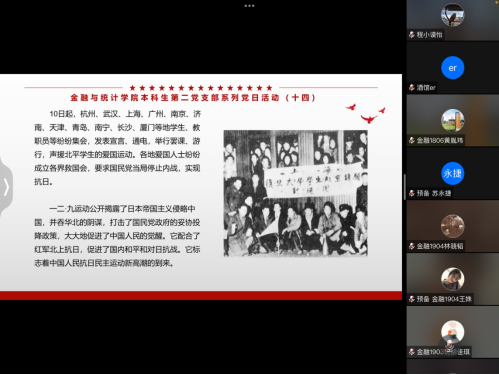 本活动由sunbet集团中国官网入口本科生第二党支部支委牵头举办,支部副书记许筱颖同志领学,以线上观看视频、分享经历等形式使同学们对一二九的历史和精神有更深入的了解,让同学们进一步明白新时代时代青年人的责任与担当,在“两个一百年”奋斗目标的历史交汇点努力奋斗。在新时代彰显新作为,努力做到不负组织培养、不负人民期盼。参与学习活动的党员纷纷表达了自己的学习感想: