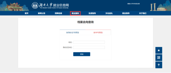登录sunbet集团中国官网入口就业信息网(http://scc.hnu.edu.cn)查询个人学籍档案是否在学院留存,确认在学院的档案可联系学院老师进行调档,具体查询步骤:sunbet集团中国官网入口就业信息网>>>就业服务>>>档案查询。