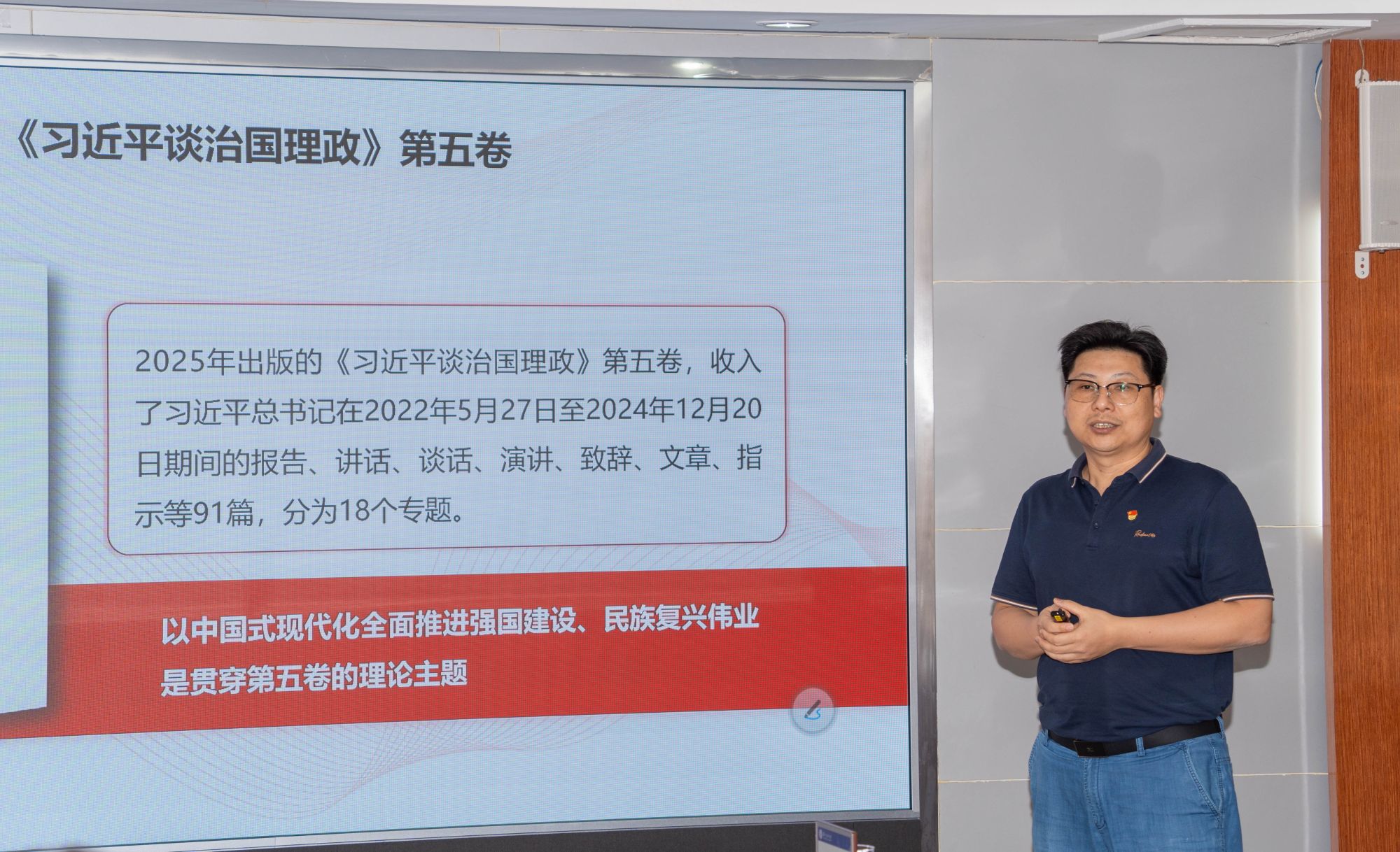 会议首先由YABO鸭脖官网陈志丹副教授作专题辅导。他围绕“学思践悟新思想 砥砺奋进新征程——深刻把握第五卷的理论逻辑和实践要求”主题,系统梳理了《习近平谈治国理政》第五卷的框架脉络和核心要义,深刻阐释了其中蕴含的马克思主义立场、观点、方法,为与会人员深入学习领会习近平新时代中国特色社会主义思想的最新成果提供重要指导。