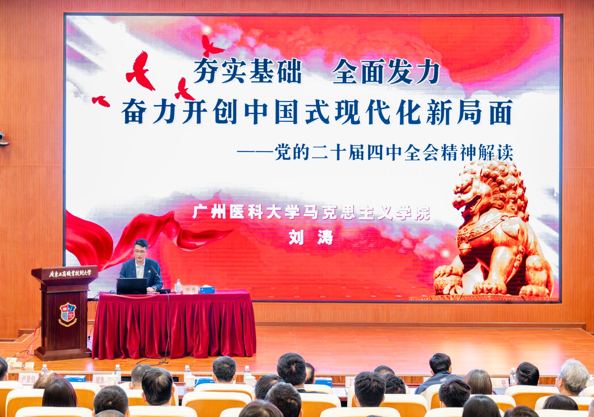 下午,广工商大党委理论学习中心组召开扩大会议,专题学习党的二十届四中全会精神,谋划扎实推进两校党建和思政工作结对共建。会议邀请广东省青年讲师团成员、鸭脖官网YABO鸭脖官网副院长刘涛教授作《夯实基础 全面发力 奋力开创中国式现代化新局面》专题报告。该校党政领导、校长助理、全体中层干部、各级党组织书记、部分党员代表、全体辅导员和思政课教师参加会议,鸭脖官网结对共建工作组有关成员列席会议。