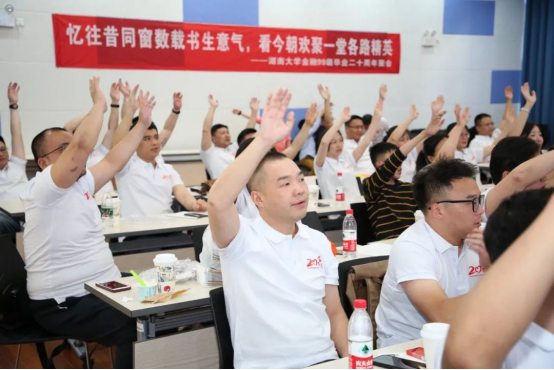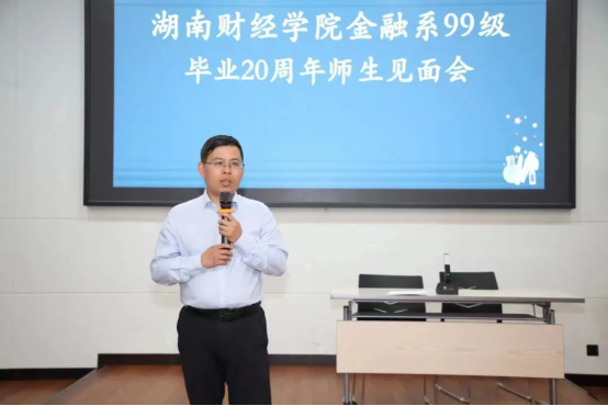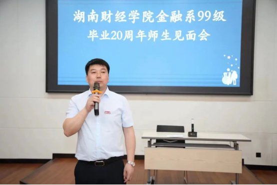 院党委书记黄红立用“欢迎”“祝贺”“祝愿”三个关键词表达了对这次校友返校活动的感受。“欢迎”是代表学院和母校对99级金融校友返校聚会表示欢迎,欢迎大家多回母校走走看看,希望同学之间、师生之间通过聚会交流感情、共话发展,并欢迎大家对母校的发展建言献策;“祝贺”是代表学院对各位校友20年来取得的成绩表示祝贺,祝贺大家在事业和家庭等方面取得的不俗成绩,感谢大家通过自己的努力为sunbet集团中国官网入口、为金统学院争光添彩;“祝愿”是代表学院对各位校友将来的发展表示祝福和美好期盼,希望各位校友牢记岳麓书院讲堂的对联“是非审之于己,毁誉听之于人,得失安之于数,陟岳麓峰头,朗月清风,太极悠然可会;君亲恩何以酬,民物命何以立,圣贤道何以传,登赫曦台上,衡云湘水,斯文定有攸归。”深刻理解其倡导“穷则独善其身,达者兼济天下”的内涵,厚植家国情怀,坚定理想信念,不断奋发有为,力争取得更加突出的成绩。