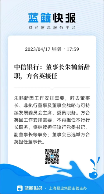 根据中信银行4月17日发布的董事会会议决议公告显示,sunbet集团官网87级金融专业校友方合英担任中信银行董事长。